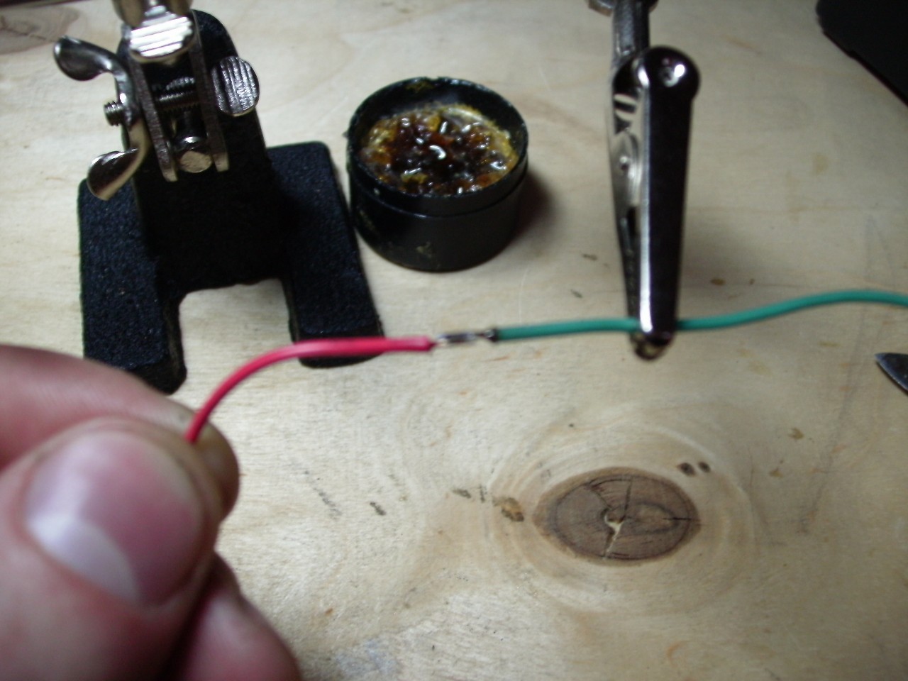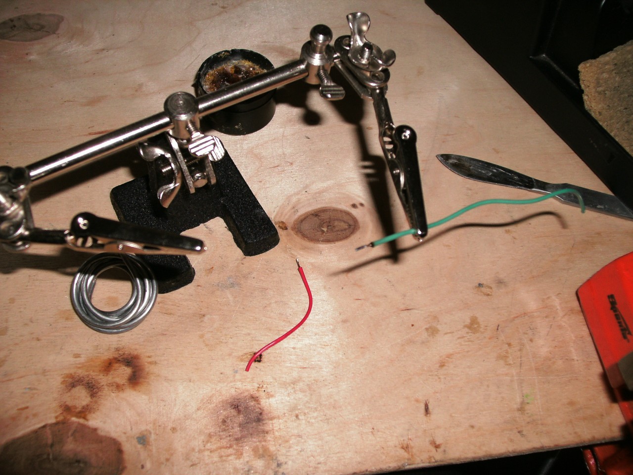 С помощью устройства "третья рука" зажимаем один из проводков в крокодил.